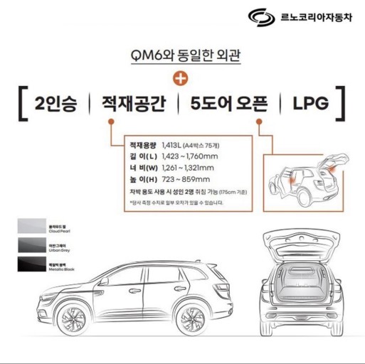 QM6 퀘스트는 국내 유일 LPG SUV 차량인 QM6가 패밀리형에서 2인승 밴으로 출시되는데요. 외관은 현재 차량과 동일합니다.
