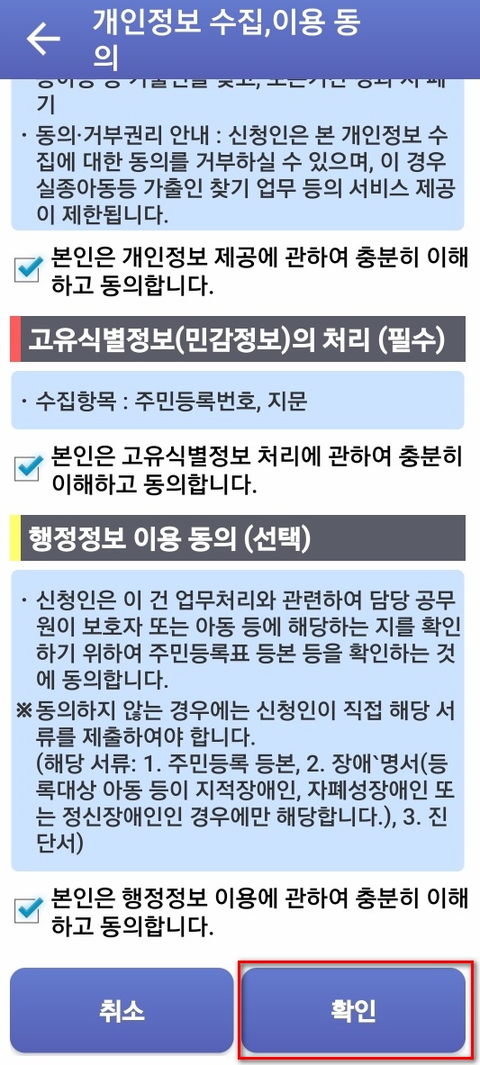 3. 개인정보 수집, 이용동의 체크 후 확인