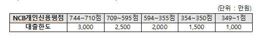 대출한도는 개인기업 또는 법인기업 당 3천만 원 범위 이내로 대출신청일의 NCB개인신용평점 기준으로 신용평점 구간별로 한도 차등화됩니다.