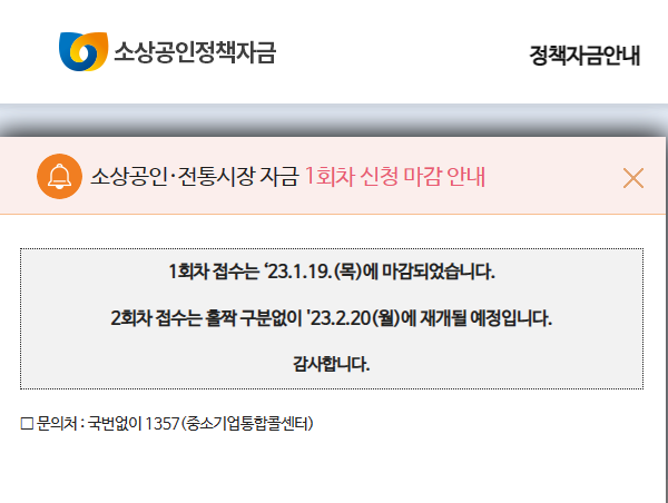 1회차 접수는 ‘23.1.19.(목)에 마감되었습니다. 2회차 접수는 홀짝 구분없이 '23.2.20(월)에 재개될 예정입니다. 감사합니다. □ 문의처 : 국번없이 1357(중소기업통합콜센터)